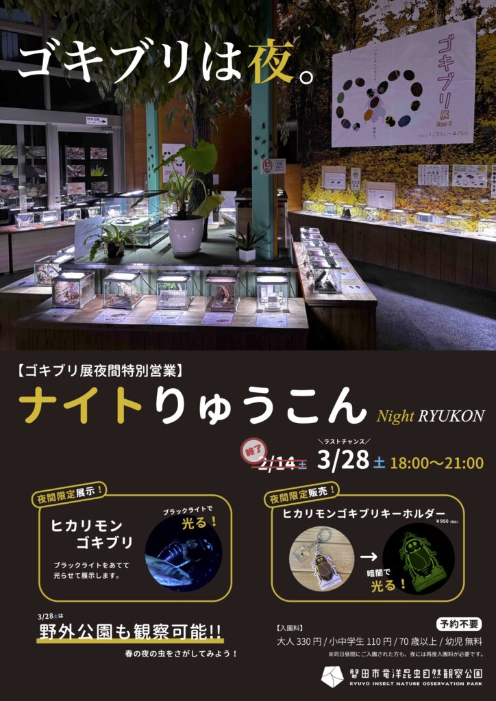 ゴキブリ展夜間特別営業「ナイトりゅうこん」を開催します。